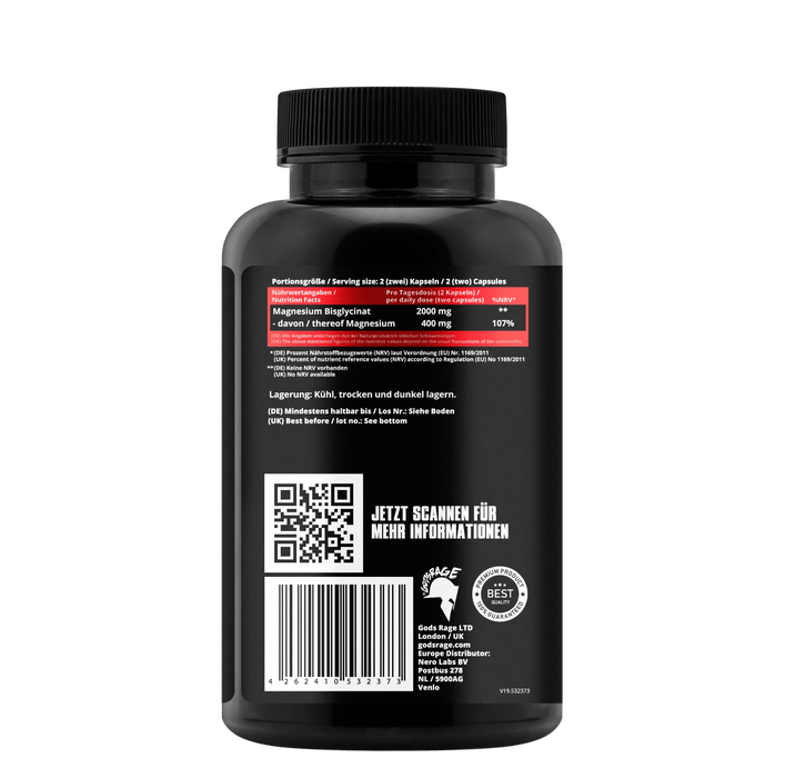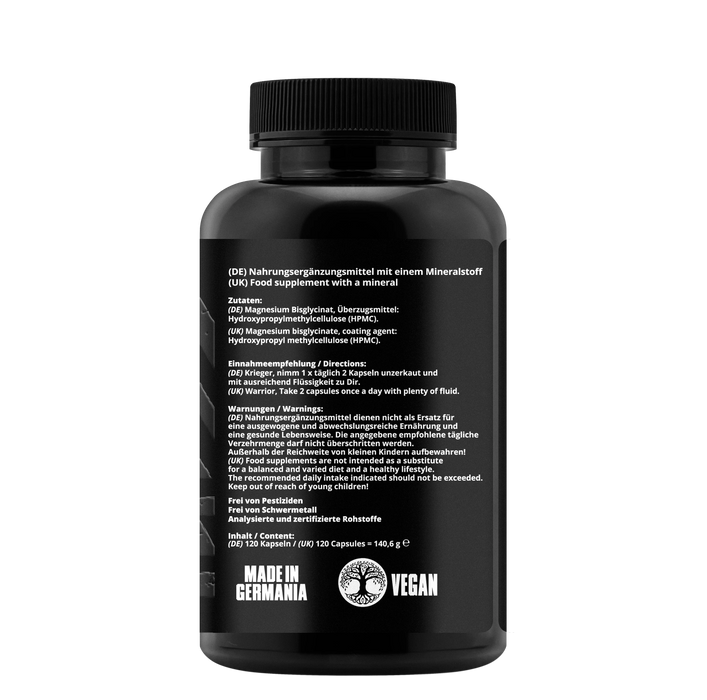 Zutaten: Magnesium Bisglycinat (20% reines Magnesium), Kapselhülle: Hydroxypropylmethylcellulose, Füllstoff: Mikrokristalline Cellulose